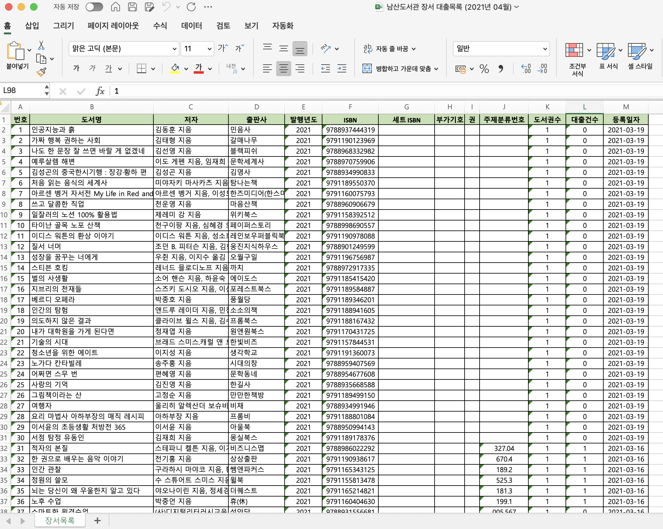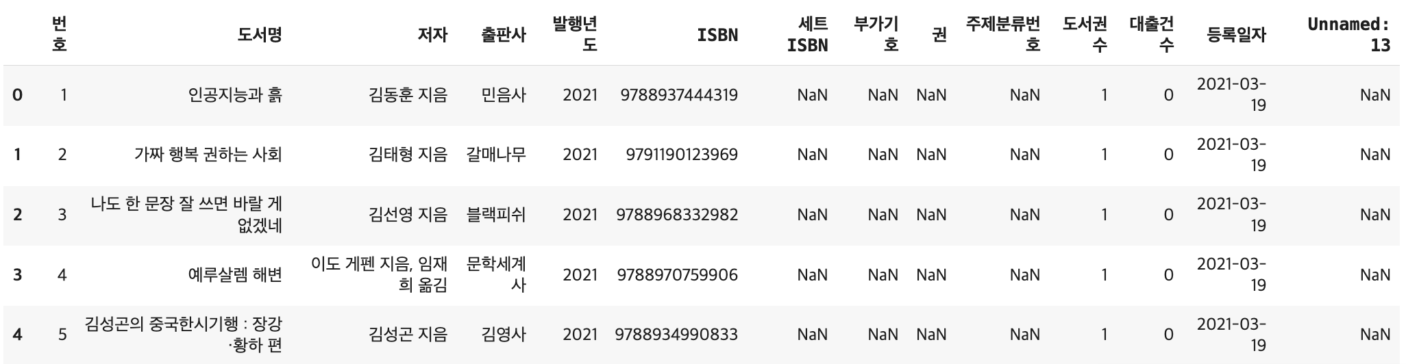 df = pd.read_csv('남산도서관 장서 대출목록 (2021년 04월).csv', encoding='EUC-KR', low_memory=False)