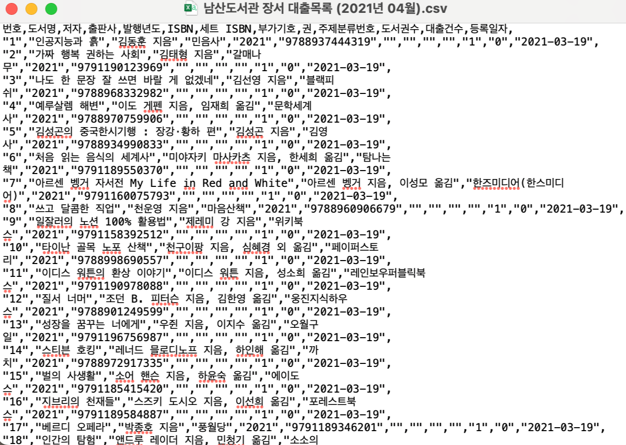 with open('남산도서관 장서 대출목록 (2021년 04월).csv') as f: