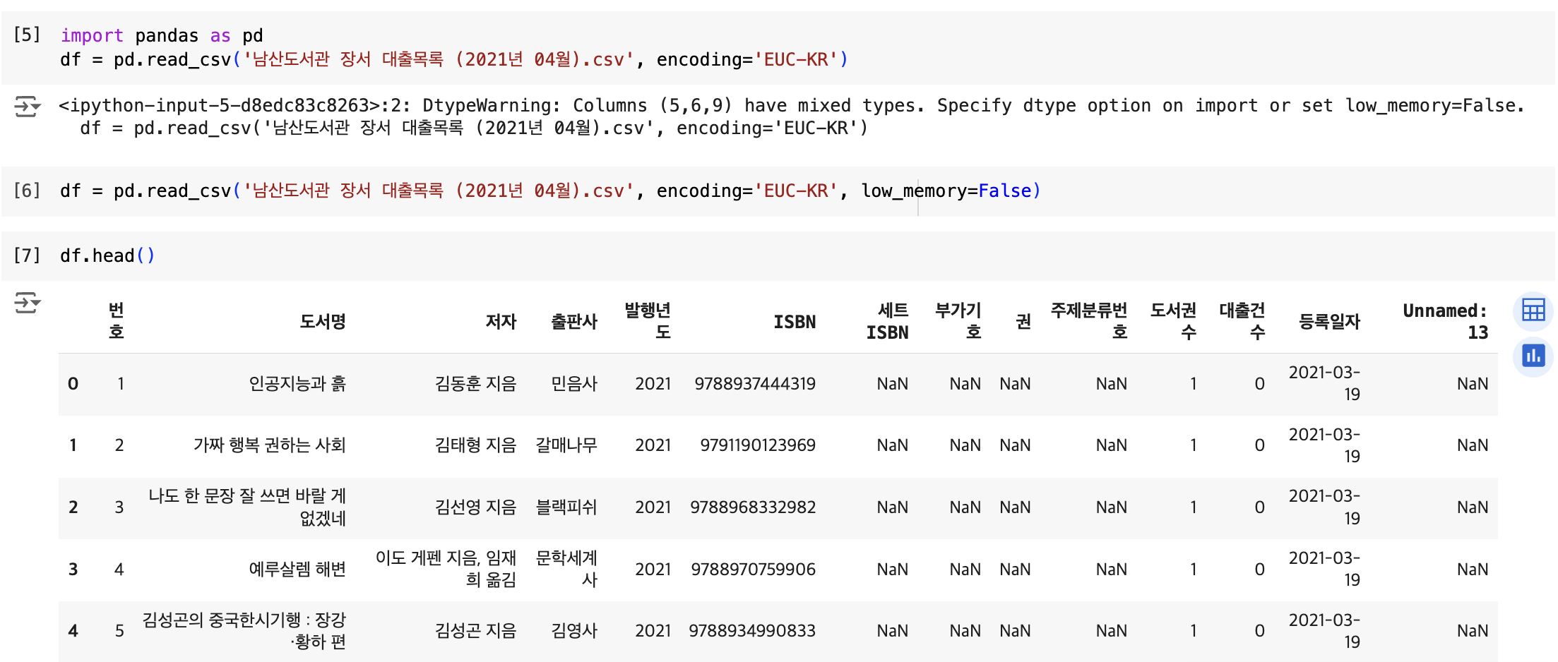 df = pd.read_csv('남산도서관 장서 대출목록 (2021년 04월).csv', encoding='EUC-KR', low_memory=False)