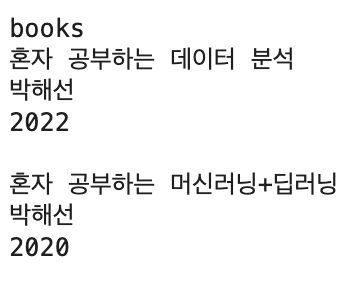 {"name": "혼자 공부하는 머신러닝+딥러닝", "author": "박해선", "year": 2020}