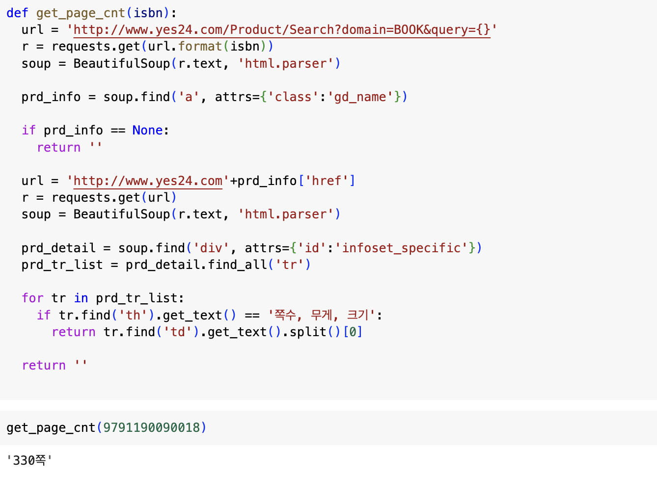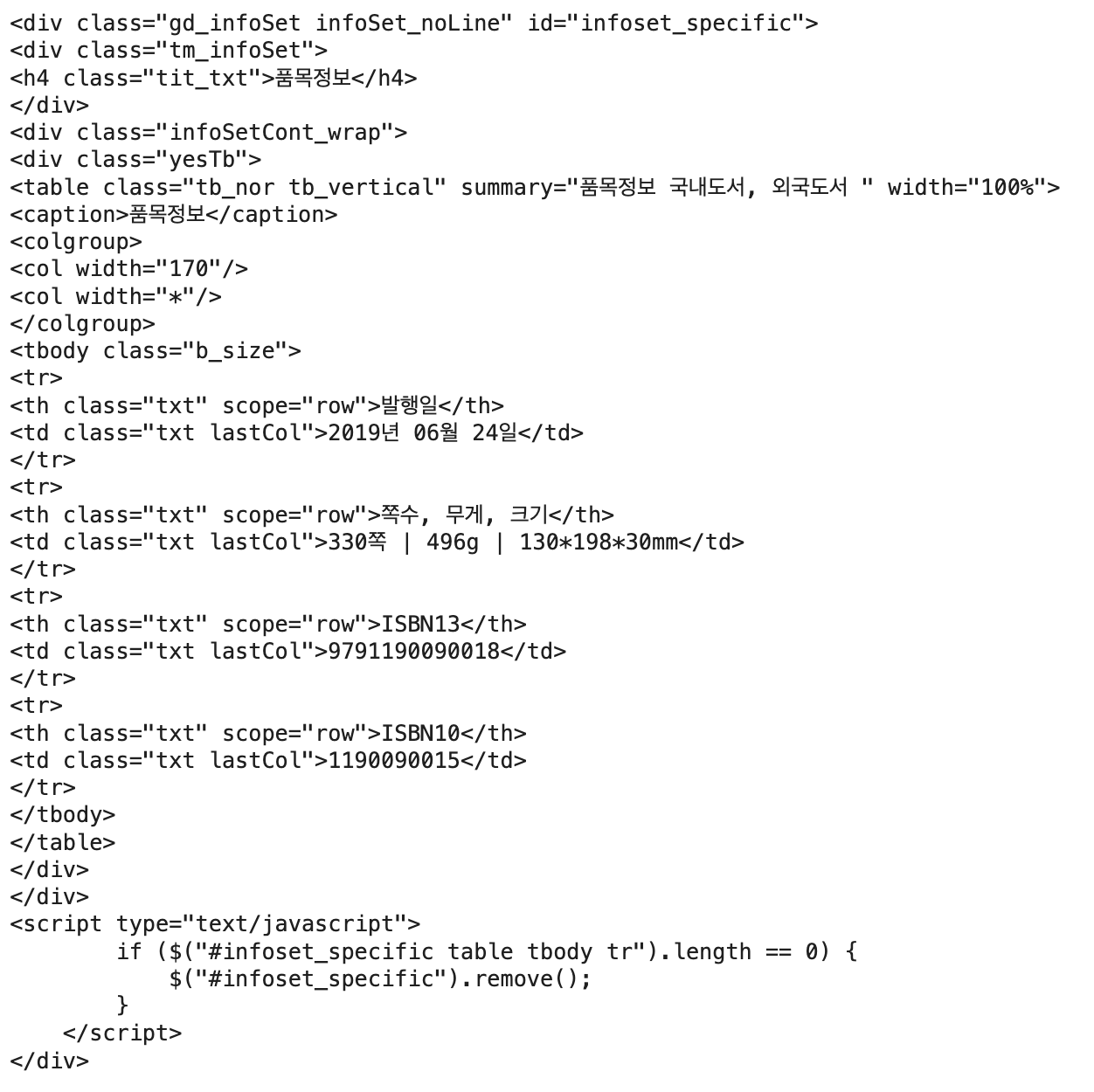if tr.find('th').get_text() == '쪽수, 무게, 크기': #th가 '쪽수, 무게, 크기'인 지 확인