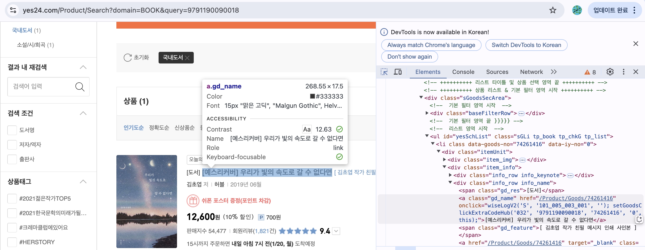 isbn = 9791190090018 # '우리가 빛의 속도로 갈 수 없다면' ISBN