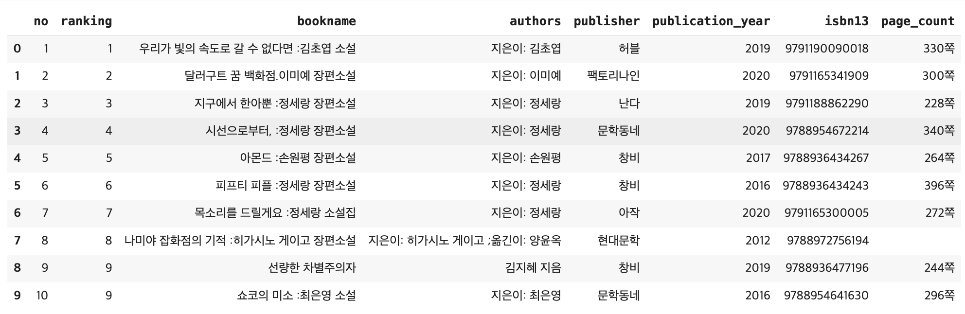 books = book_df.loc[:, 'no':'isnb13'] # 전체 행과 'no' 열에서 'isnb13' 열까지