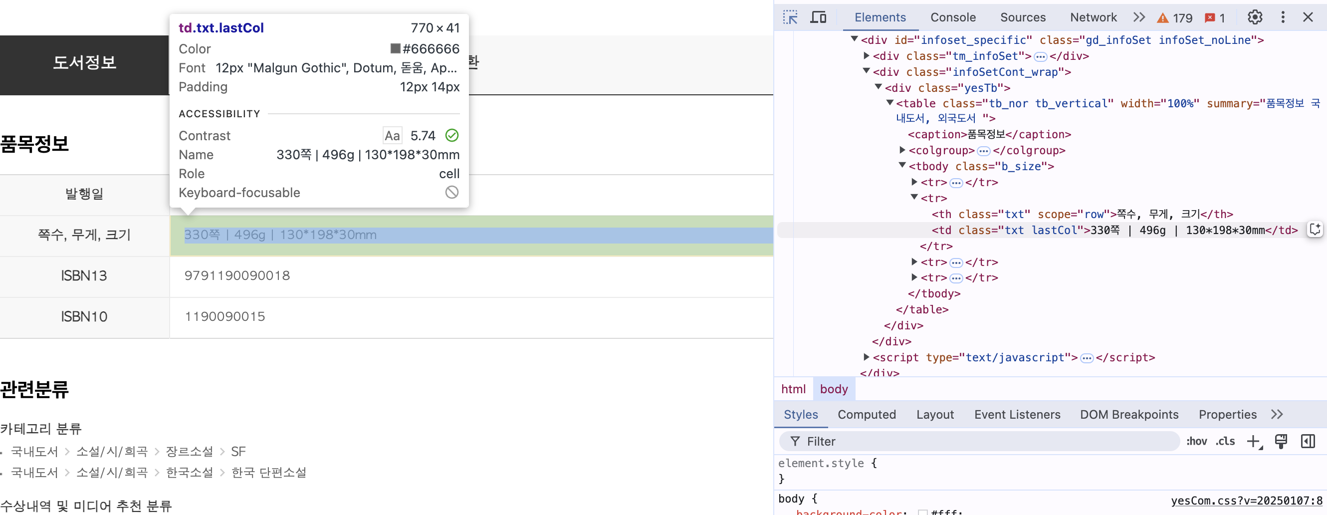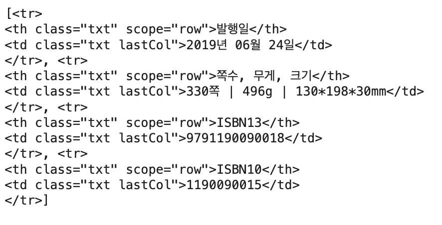 if tr.find('th').get_text() == '쪽수, 무게, 크기': #th가 '쪽수, 무게, 크기'인 지 확인