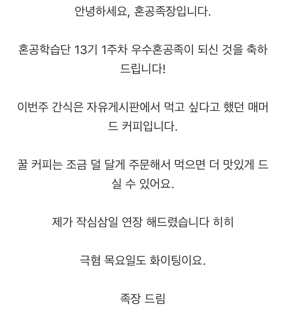 주변에.. 메머드 익스프레스가 없어.. 꿀커피를 마시며 하지는 못하지만..3주차에 꼭..!! 가서 먹으리.. 기다려라 꿀커피..