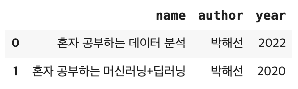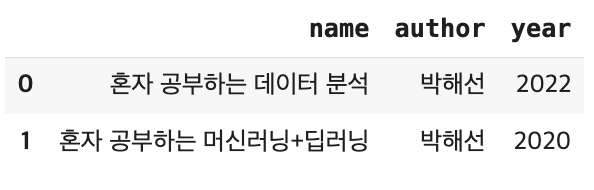 {"name": "혼자 공부하는 데이터 분석", "author": "박해선", "year": 2022},