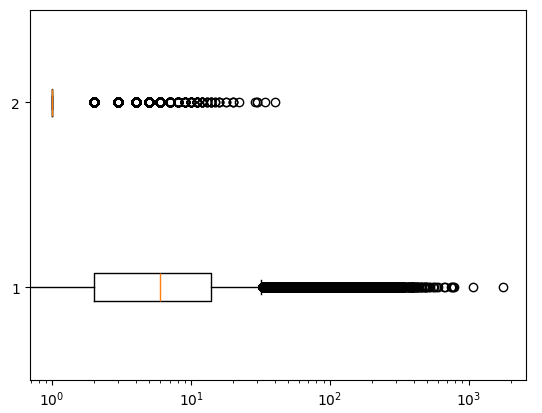plt.boxplot(ns_book7[['대출건수','도서권수']], vert=False)