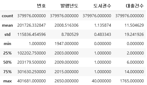 → 도서권수의 최솟값은 0 ? 도서를 가지고 있지 않은데 대출 데이터에 포함되어 있는 것 !
