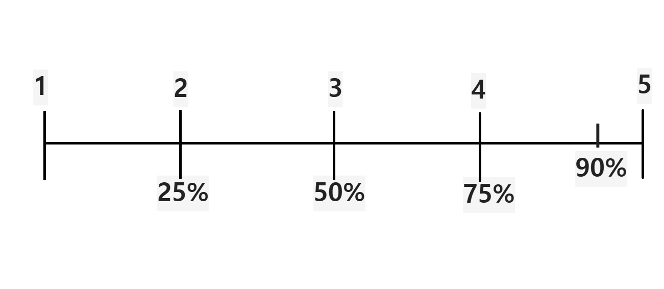 90%에 해당하는 값은 4(0.75)와 5(1.0)사이에 위치 → 4와 5사이의 90% 지점