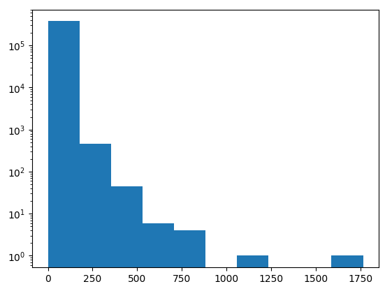 plt.hist(ns_book7['대출건수'], log=True) #log 매개변수 사용