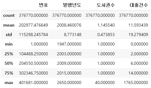 → 도서권수의 최솟값은 0 ? 도서를 가지고 있지 않은데 대출 데이터에 포함되어 있는 것 !