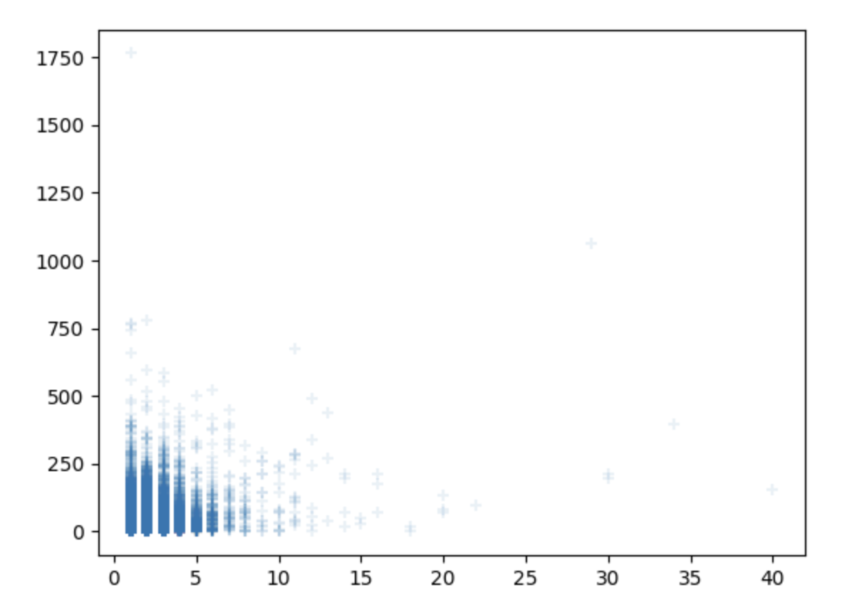 plt.scatter(ns_book7['도서권수'], ns_book7['대출건수'], alpha=0.1, marker='+')